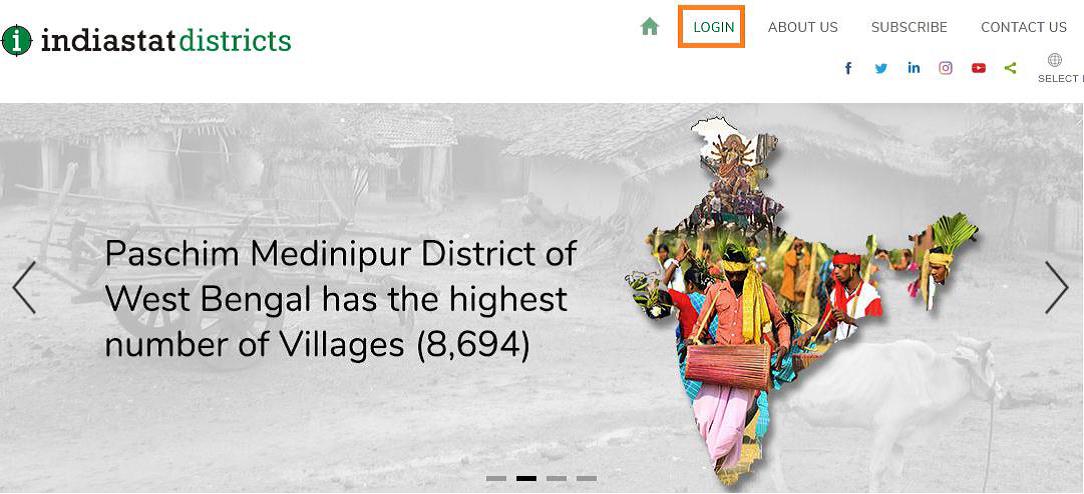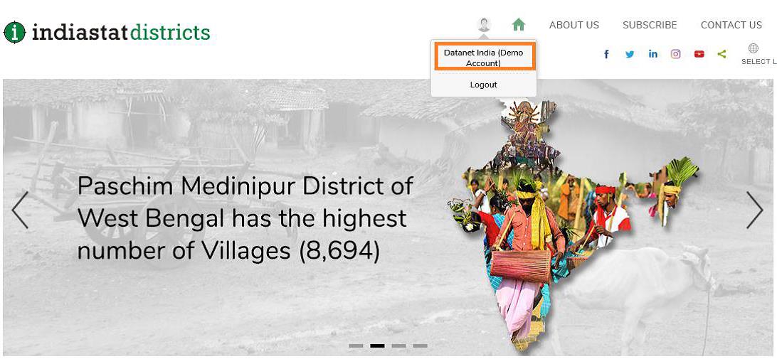 After clicking on the LOGIN tab, both in the case of IP login or Username and Password based access, the access will be authorize and on successful authorization, the name of Institution/Company/Individual will be appeared within the Subscriber/IndiastatDistricts log as indicated the image below, which means that the login is successfully made and data can now be accessed.